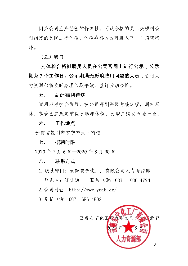 云南安寧化工廠(chǎng)有限公司2020年校園招聘公告